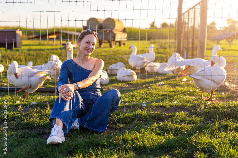 Portrait young adult happy smiling woman wear jeans denim jumpsuit enjoy having fun countryside farm animal geese flock warm sunset light. Female person rural country village farmyard bird poultry