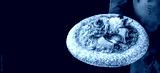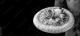 Chef holding a plate of seafood risotto with octopus, mussels, parmesan, and basil on a dark background. copy space