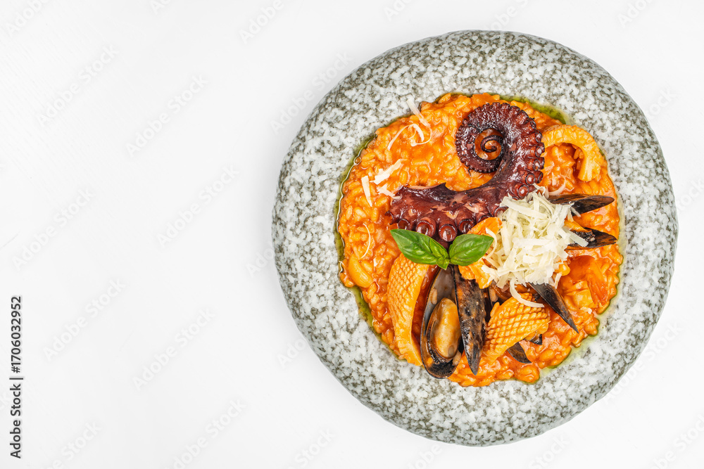 Seafood risotto with octopus, mussels, parmesan, and basil on a ceramic plate. copy space, top view