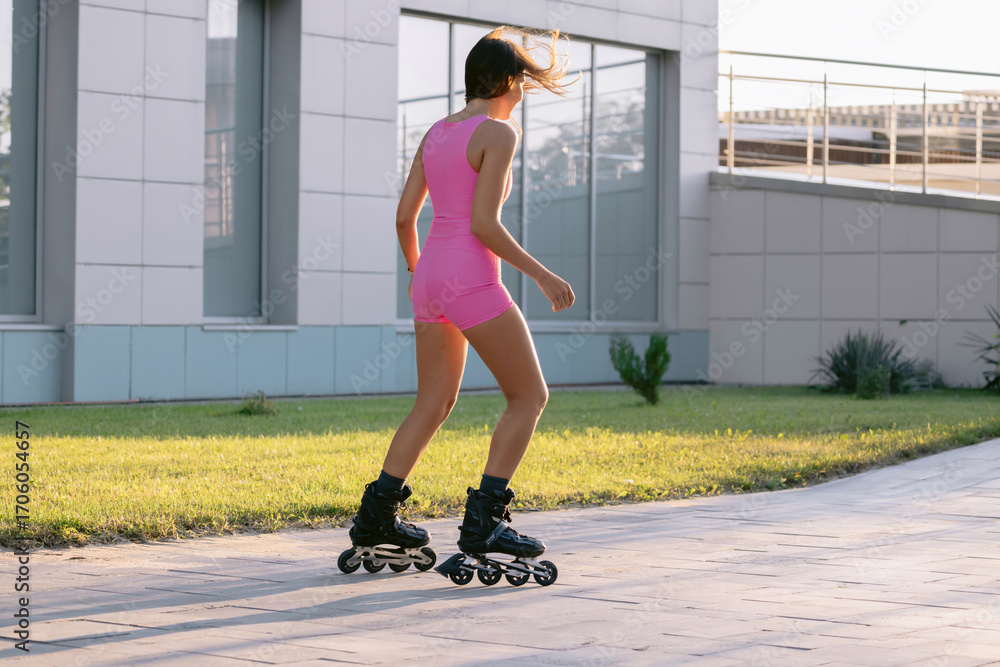 Sexy woman in pink sportswear rollerblading outdoors on a sunny day, active lifestyle and fitness concept.