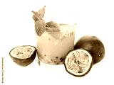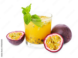 Tasty passion fruit drink with mint and fresh fruits isolated on white