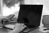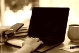 Woman with smartphone working on laptop at table against blurred background, closeup