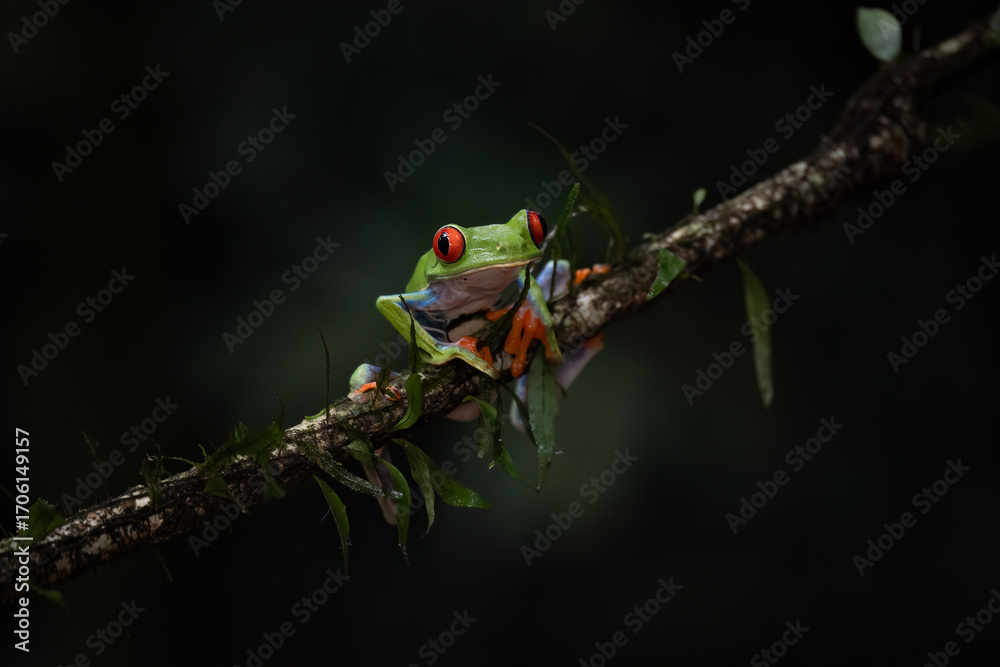 Frontal portrait of a Red-eyed leaf frog (Agalychnis callidryas) on a branch, Costa Rica