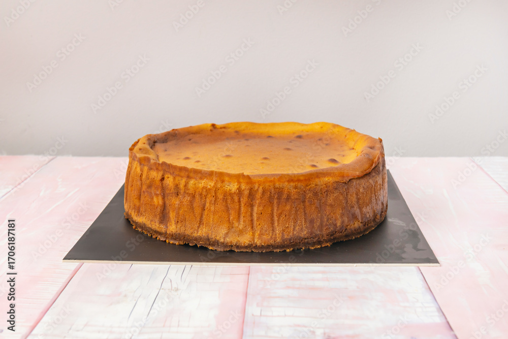 Coffee cheesecake with an intense espresso flavor, decorated with chocolate-covered coffee beans and a drizzle of liquid caramel
