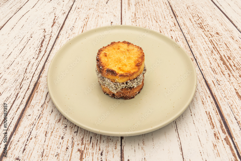 Red berry alfajores with vanilla cookies filled with raspberry jam and topped with pink icing and freeze-dried fruit