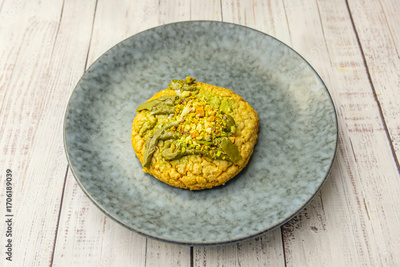 Green matcha cookies with white chocolate chips, vibrant green color and earthy flavor, decorated with powdered sugar.