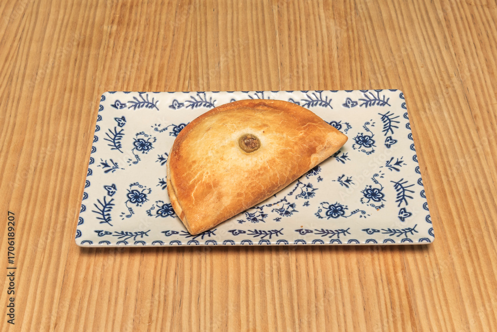 Octopus and La Vera paprika empanadas, soft and thin dough, presented on a wooden board with coarse salt
