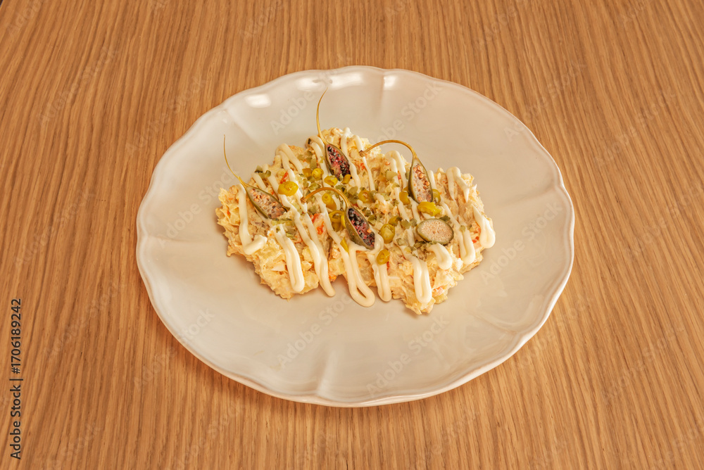 Russian salad with potato, apple, and walnuts, tossed with yogurt mayonnaise and fresh dill