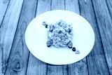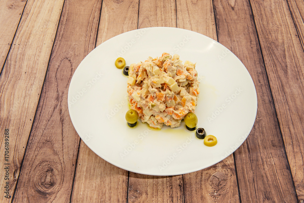 Desalted cod Russian salad with potato, orange, and olives, emulsified with saffron mayonnaise