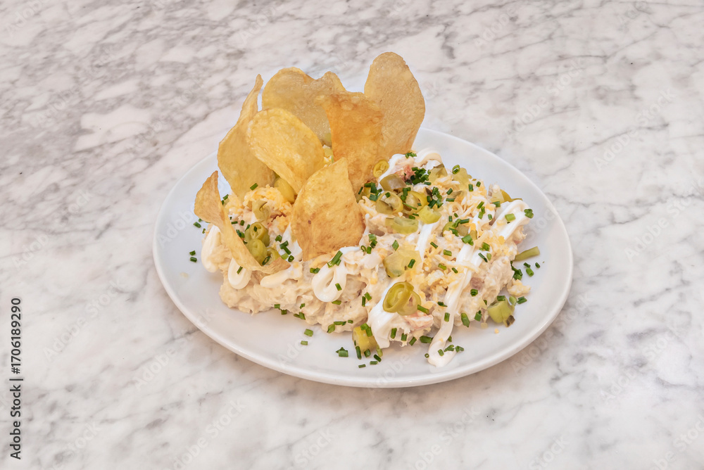 Russian salad with potato, arugula, and cherry tomatoes, dressed with a honey and mustard vinaigrette