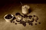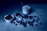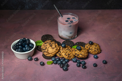A vibrant, deep purple smoothie in a glass decorated with an orange slice, accompanied by shortbread and blueberry cookies on a bright, light purple background