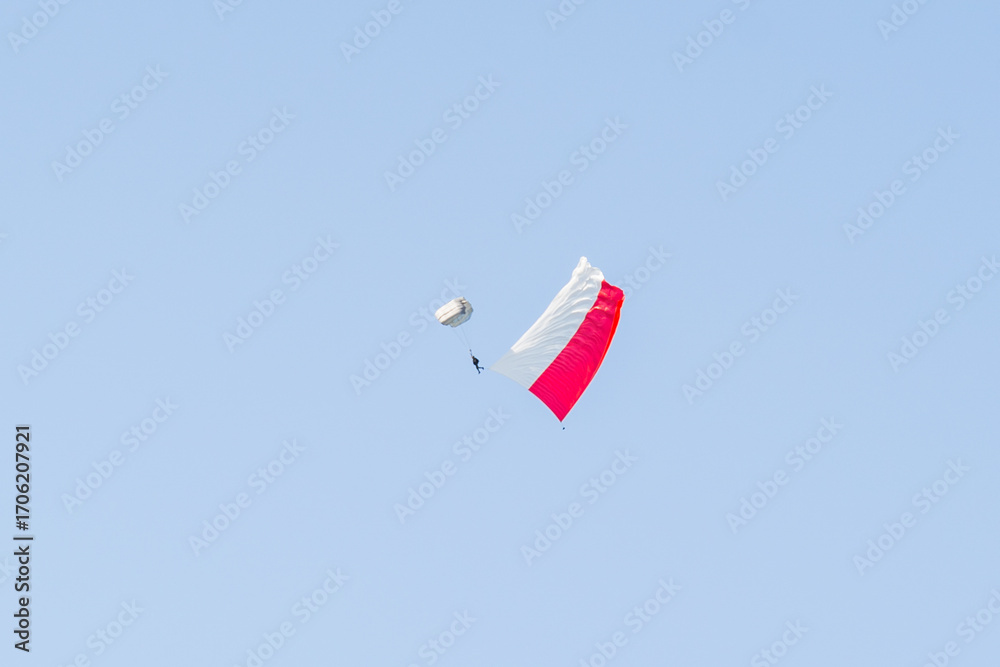 Skydiver gracefully descends under a vibrant parachute against a clear blue sky during a sunny afternoon