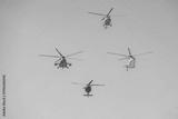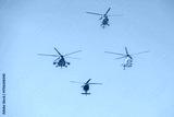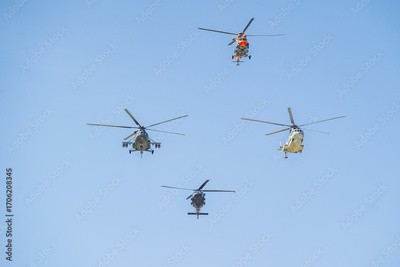 Multiple helicopters performing coordinated maneuvers in a clear blue sky during an air show