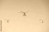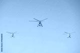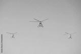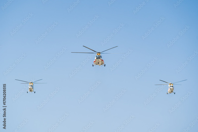 Three helicopters fly in formation above a clear sky during a bright day showcasing aerial teamwork and technology