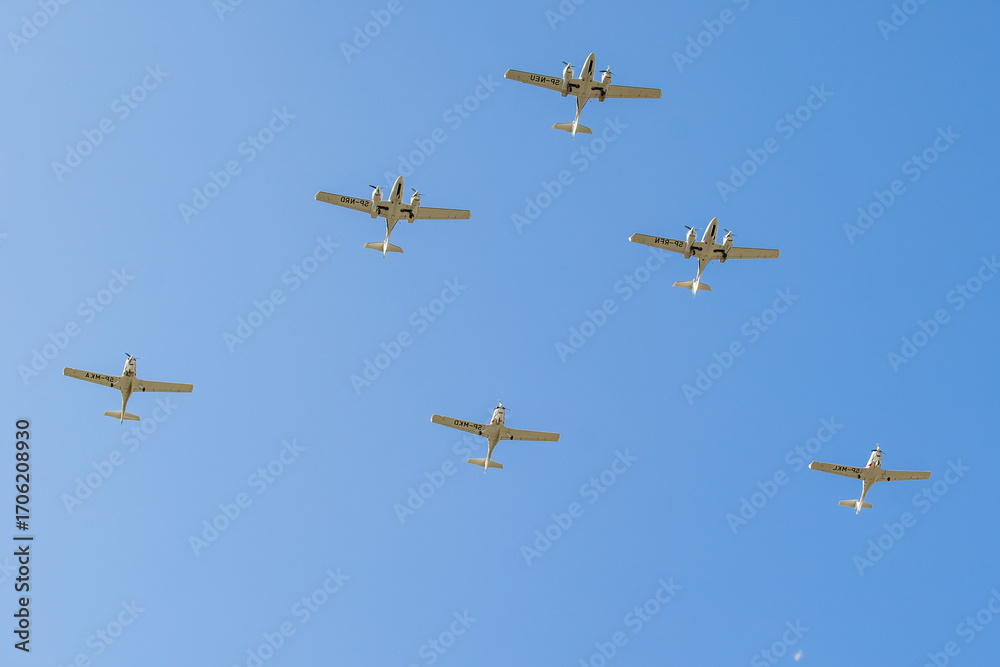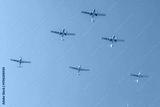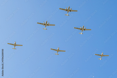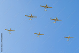 Four Diamond DA42 Twin Stars flying gracefully in a formation against a bright blue sky during a clear day