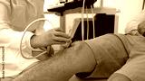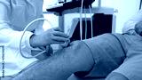 Sonography of knee joint. Male patient with knee injury during knee ultrasound with professional sonographer