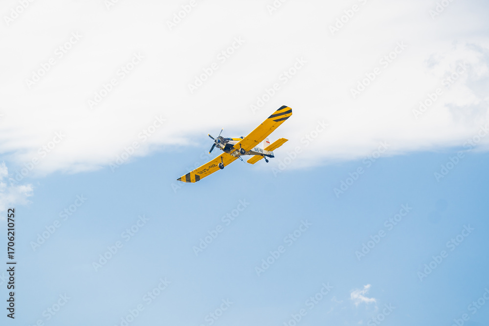 Yellow agricultural aircraft soars over a clear sky during a bright afternoon in the countryside
