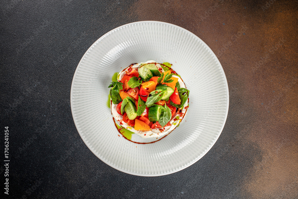 Fresh vegetable salad with cucumbers, tomatoes, herbs, and yogurt dressing on a white plate. top view