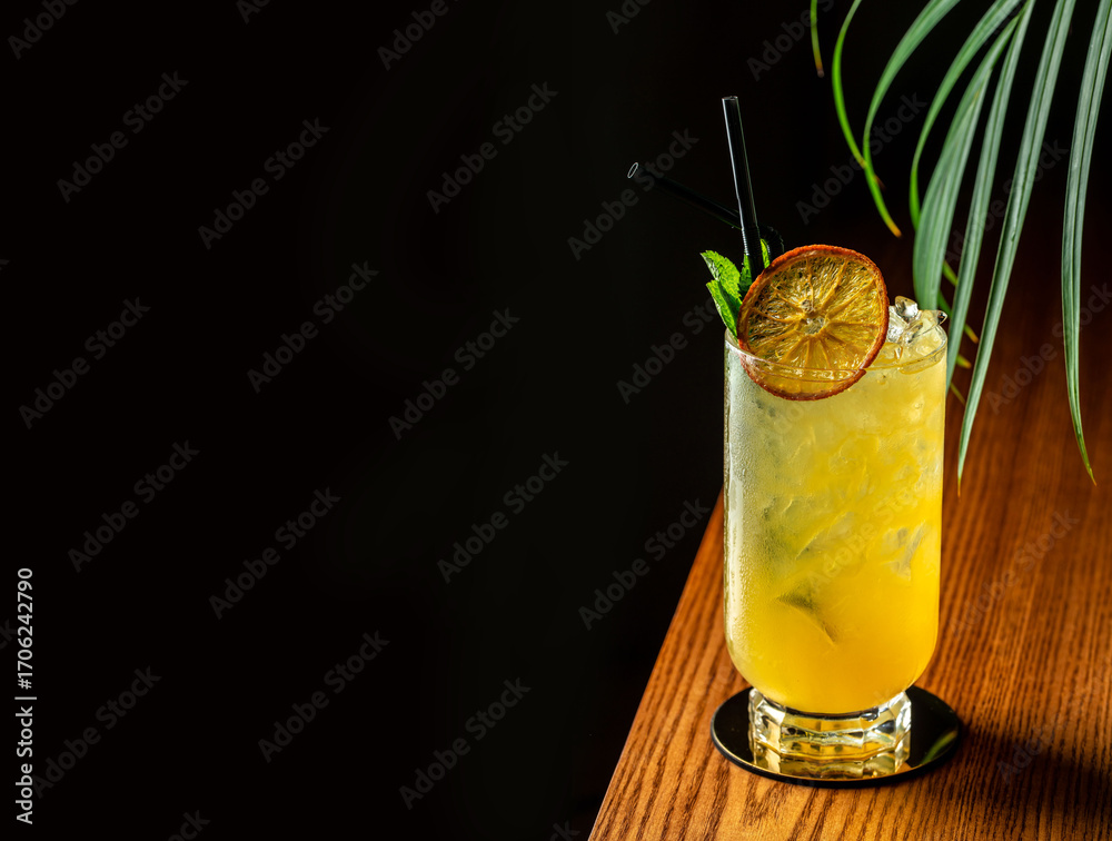 refreshing citrus cocktail with ice and mint on a wooden table. copy space