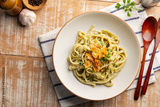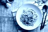 Fettuccine spinach pasta with creamy carbonara sauce topped with crispy bacon and parmesan cheese in a plate.Top view.