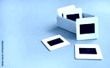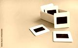 White Plastic Slide Frame Mount for slide film contained in orange plastic box with plain background, Retro nostalgia, photograph