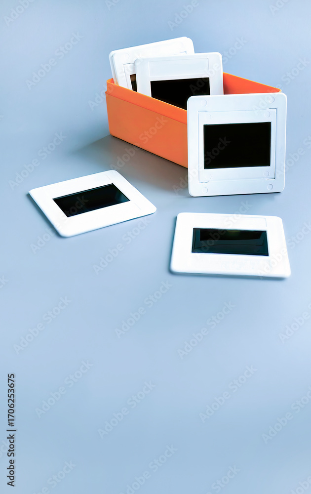 White Plastic Slide Frame Mount for slide film contained in orange plastic box with plain background, Retro nostalgia, photograph