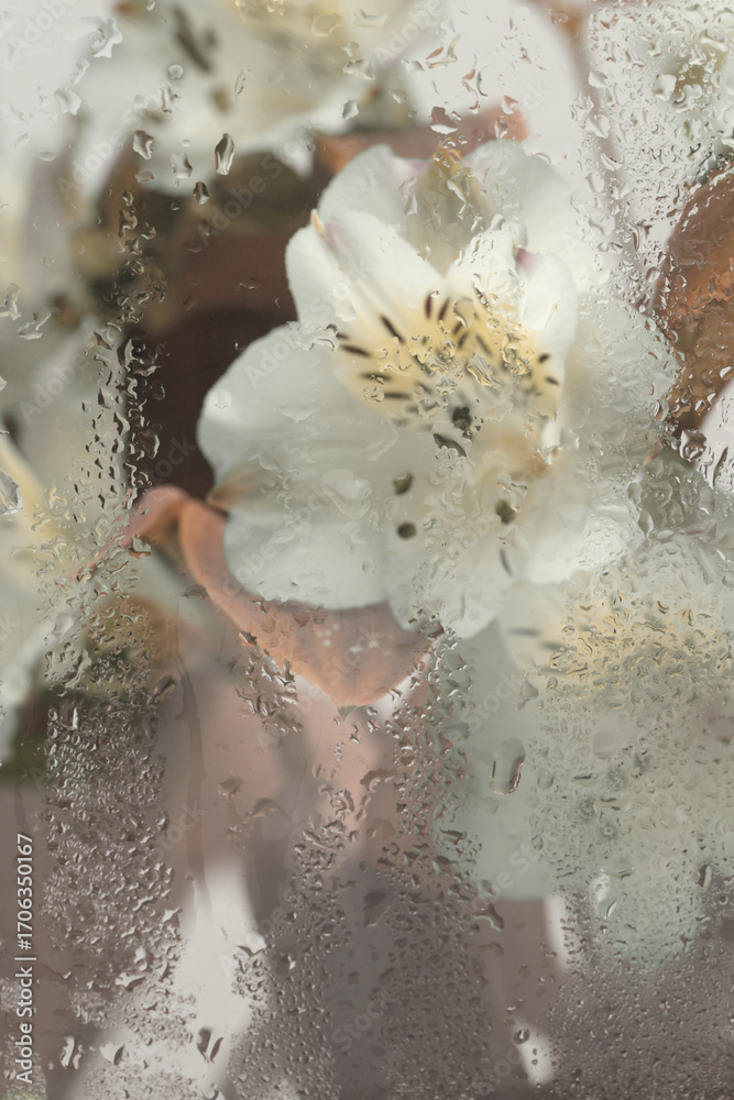 Soft focus Alstroemerieae lily flower, green leaf through glass with wet water drops. Abstract nature blur beige background.