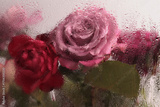 Smoke soft focus beige red, pink Rose Flower, leaf through glass with wet flow water drops. Abstract natural blur background.