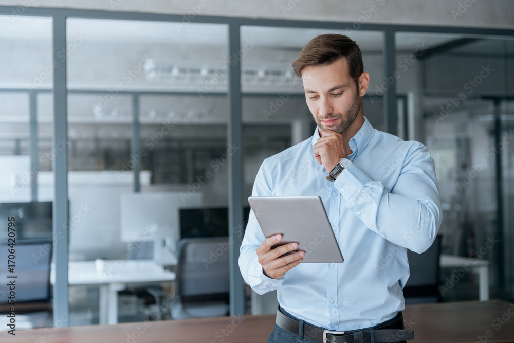Focused Latin entrepreneur businessman holding digital pc tablet standing in office. Smiling European young man working on trade online using touchpad fintech computer for business work. Copy space