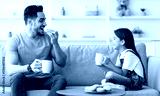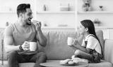 Snack Time. Portrait of cheerful little girl and man holding cups, drinking coffee and tea, eating cookies and looking at each other, dad and daughter talking sitting on the couch in living room
