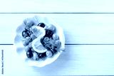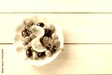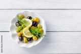 Sliced lemon with olives and dill on white wooden table