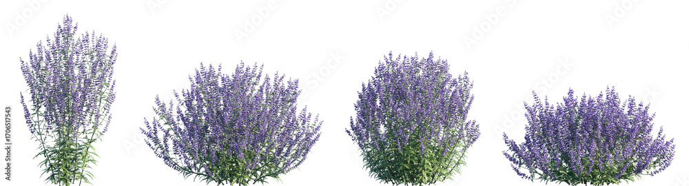 Set of Perovskia atriplicifolia (Salvia yangii, Russian sage) frontal isolated png on a transparent background perfectly cutout high resolution