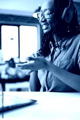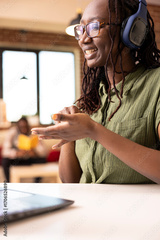 African American female entrepreneur works from cozy apartment, connecting online with clients and vendors. Black woman participates in video conference using wireless headphones and laptop.