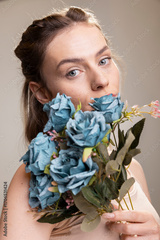 Confident person with soft skin and natural makeup look holds bouquet of blue roses. Fresh radiant complexion and graceful expression represent self care and self acceptance, wellness.
