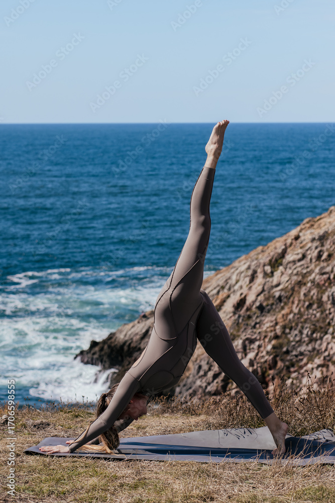 Woman practicing yoga in downward dog pose on mat by ocean, showcasing strength and flexibility against a serene coastal backdrop with clear blue skies