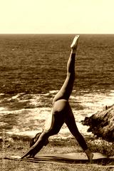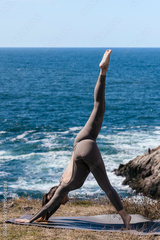 Woman practicing yoga in a downward dog pose on a mat by the ocean, showcasing flexibility and tranquility in a serene coastal environment with clear blue skies