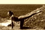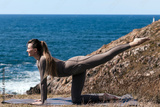 Woman practicing yoga on a mat by the ocean, performing a stretching pose with a serene expression, surrounded by natural beauty and coastal scenery, embodying tranquility and mindfulness