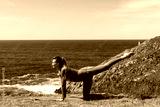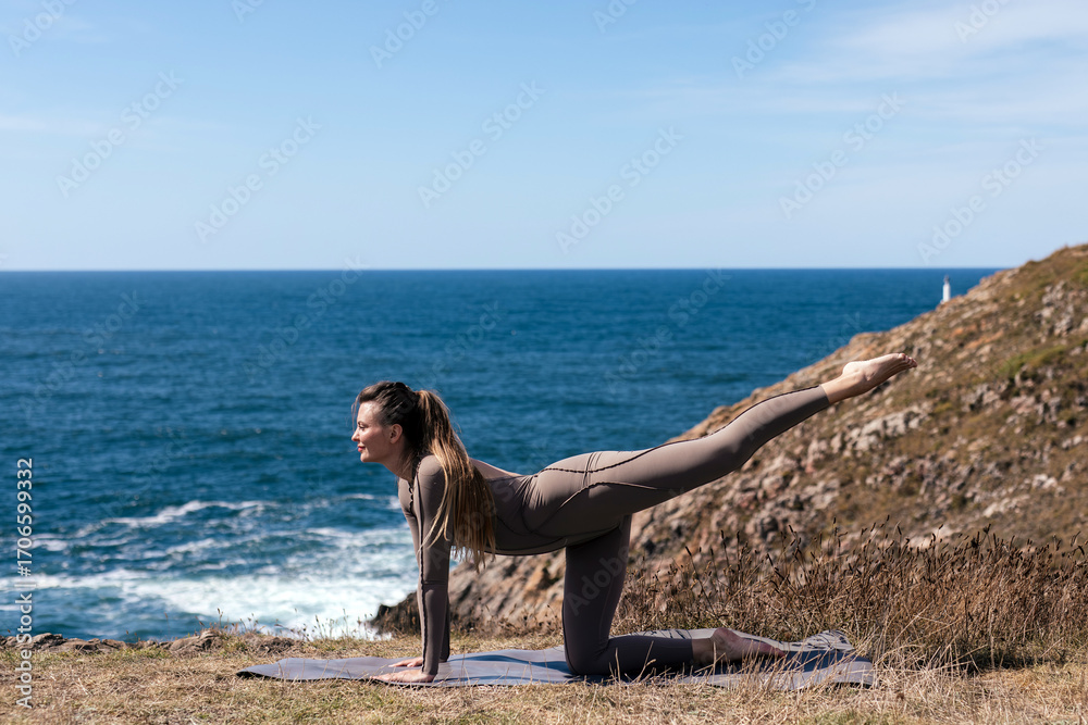 Woman practicing yoga on a mat by the ocean, stretching in a serene pose, surrounded by nature, embodying tranquility and mindfulness in a beautiful outdoor setting