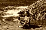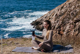 Woman practicing meditation and stretching on yoga mat by the ocean, surrounded by nature, enjoying tranquility and mindfulness in a serene outdoor environment with copy space