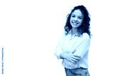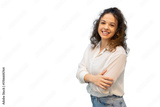 Confident professional businesswoman smiling, standing with crossed arms on transparent background, radiating success