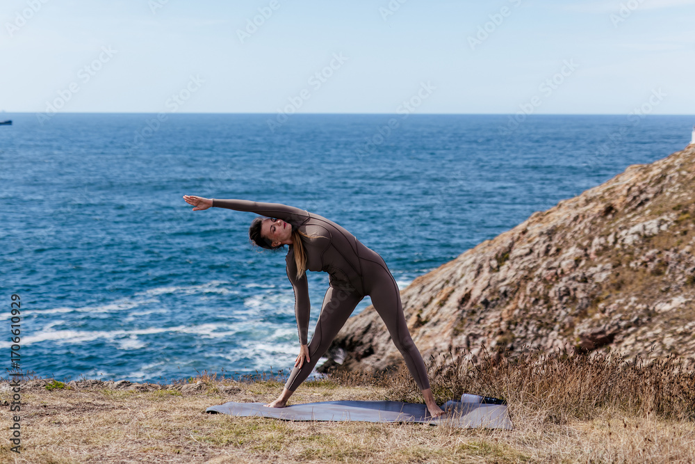 Woman practicing yoga in a serene outdoor setting, stretching gracefully on a mat, with a stunning ocean view and rocky landscape enhancing the peaceful atmosphere