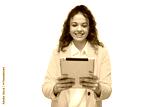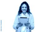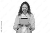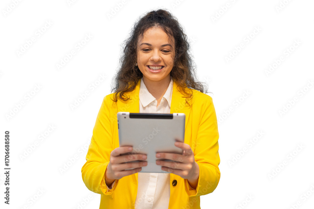 Cheerful businesswoman holding tablet, isolated on transparent background, enjoying using technology for work or entertainment