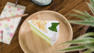green tea green cake on wooden table for relaxation time
