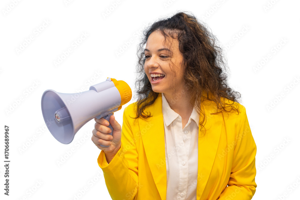 Young businesswoman shouting into megaphone with transparent background, expressing advertising, marketing, and communication concepts