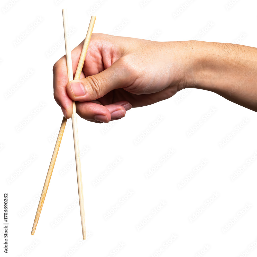Male hand holding a wood chopstick isolated on white background.