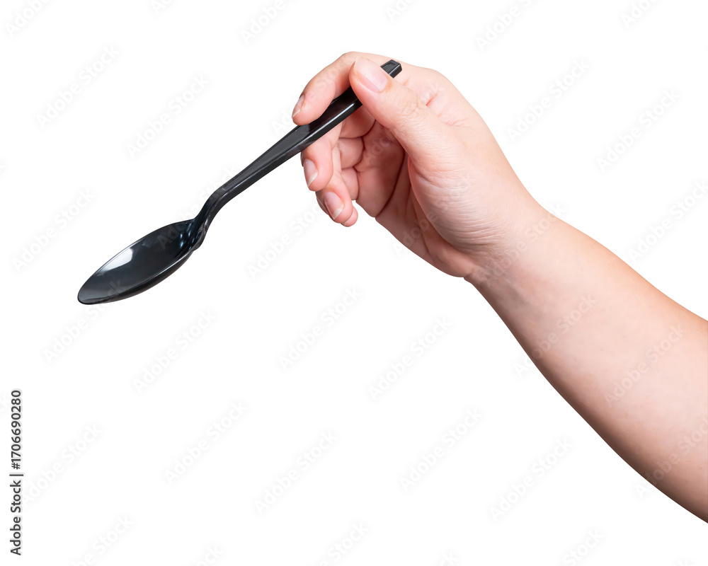 Female hand holding a black plastic spoon isolated on white background.