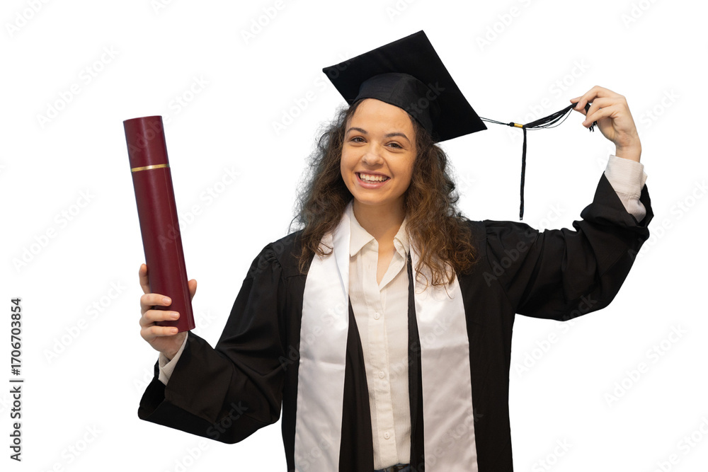 Graduate celebrating academic achievement, wearing gown and holding diploma, tasseled cap swinging against transparent backdrop