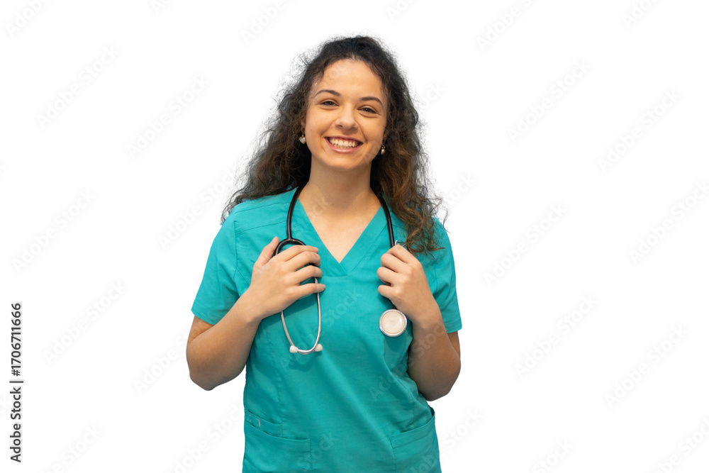 Portrait of a young female doctor or nurse smiling and holding a stethoscope, isolated on a transparent background