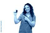 Female doctor wearing teal scrubs and stethoscope pointing at medicine bottle, recommending medication on transparent background