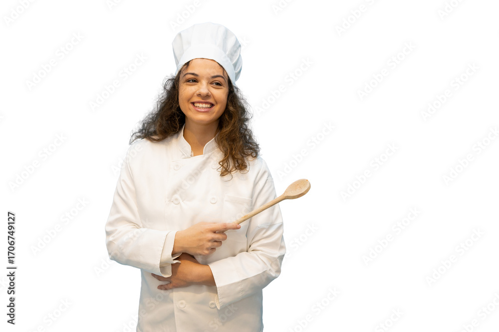 Young female chef in white uniform holding wooden spoon, smiling and looking sideways on a transparent background